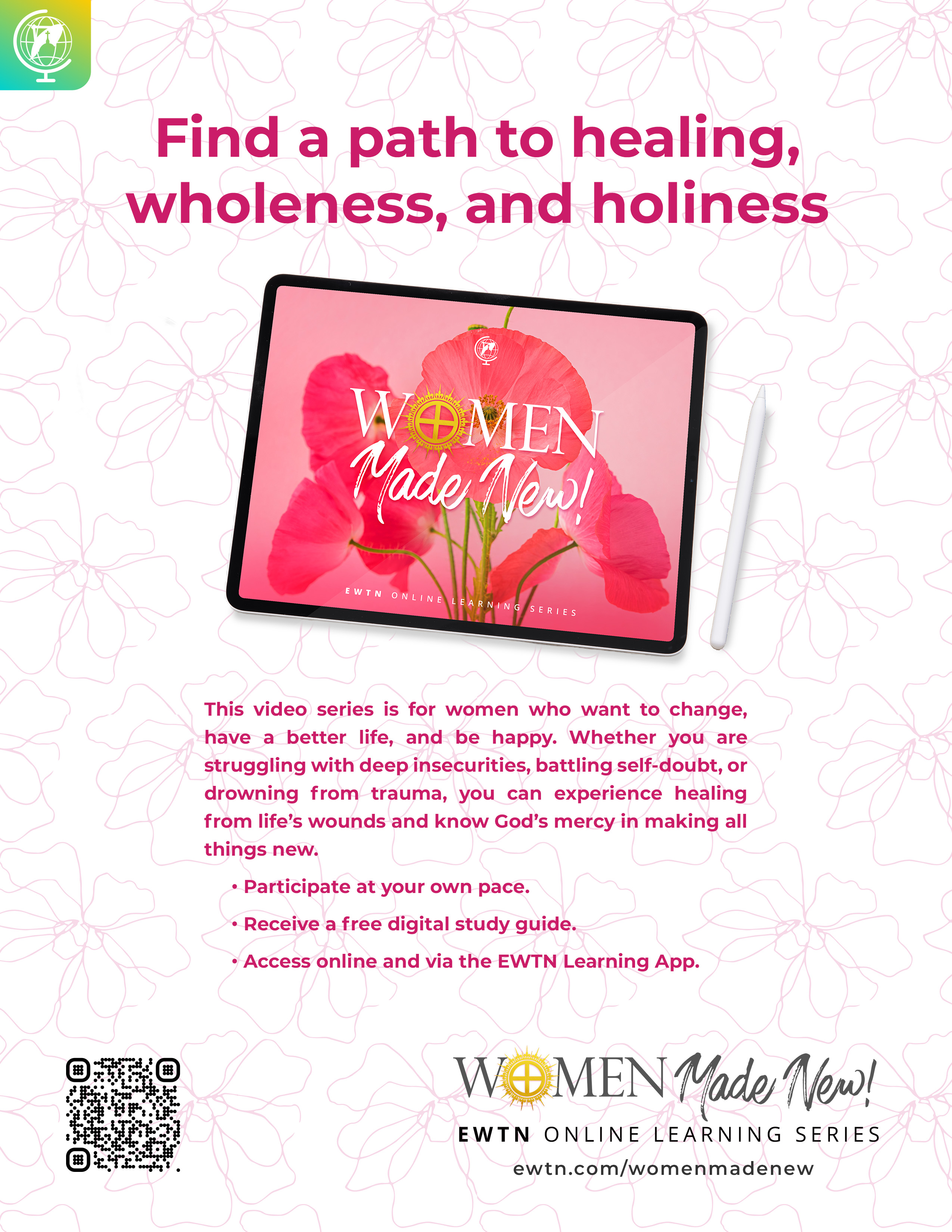 The Women Made New! EWTN Online Learning Series is an eight-part video series based on the book Women Made New! by Crystalina Evert. The series provides you with powerful reflections on adversity, transformation, and healing. It helps women find a path to healing, wholeness, and holiness. This EWTN Online Learning Series is available for free at ewtn.com/womenmadenew.