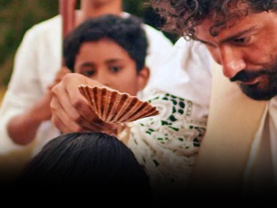 Father Luis helps Christine, Eva, Enrique and Joseph to finish off the Nativity scene in the parish. The children travel with their imaginations to the original Bethlehem and contemplate the Birth of Jesus.